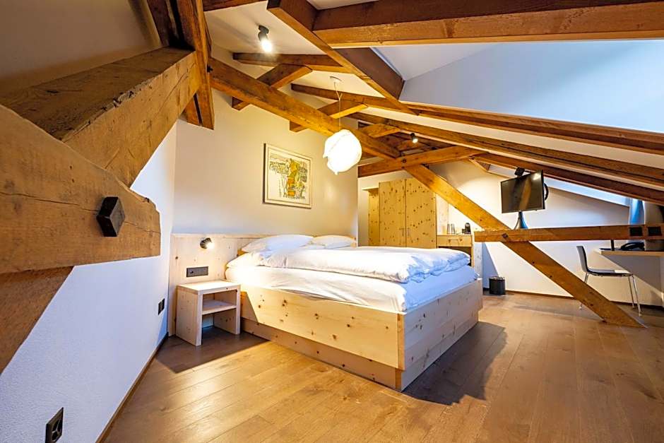 This smaller room is furbished with 2 single beds, local Arven (Swiss stone pine) wood and features a private bathroom with a shower.