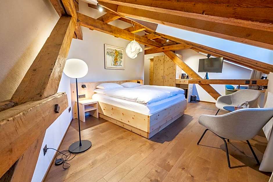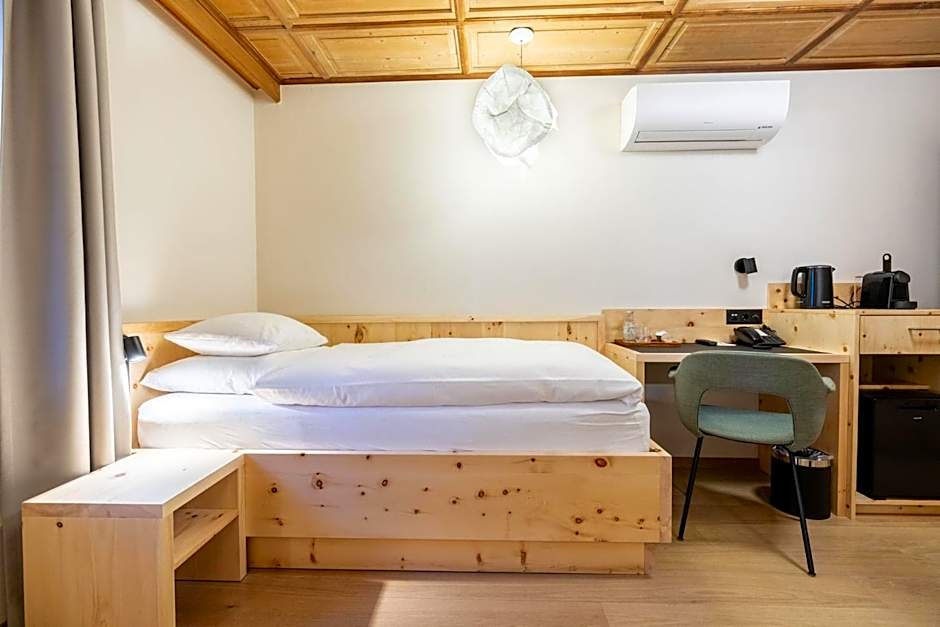 This smaller room is furbished with 2 single beds, local Arven (Swiss stone pine) wood and features a private bathroom with a shower.