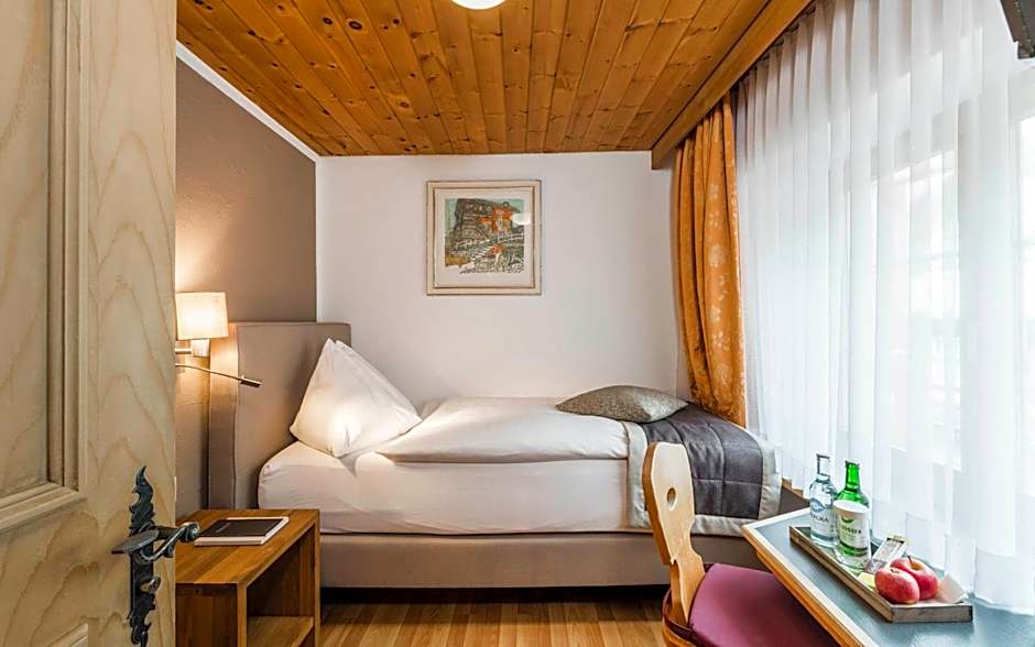 This smaller room is furbished with 2 single beds, local Arven (Swiss stone pine) wood and features a private bathroom with a shower.